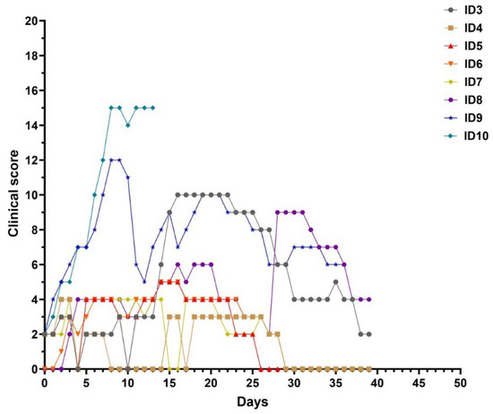 Clinical scores of six water buffaloes and two calves infected with LSDV strain. Buffaloes are identified from ID3 to ID8, whileID9 and ID10 identify cattle. Buffaloes naïve to the virus were infected on Day 0, and clinical scores were assessed every 3 days.