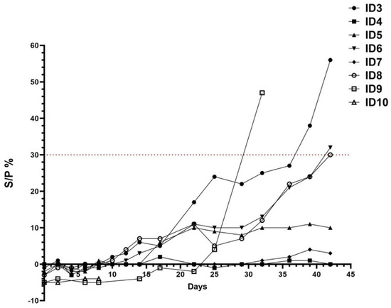 ELISA results (S/P %) over a period of 42 days of buffaloes and cattle. Buffaloes are identified as ID3 to ID8, while ID9 and ID10 identify cattle.