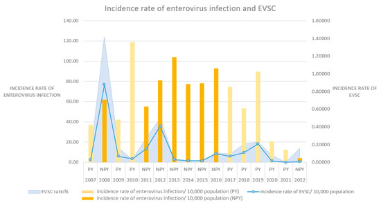 The incidence rates of enterovirus infections and EVSCs from 2007 to 2022. (PY: ping-year; NPY: non-ping-year).