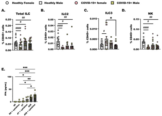 Characterization of innate lymphoid cells in the blood of COVID-19+ individuals out to 4 weeks of SARS-CoV-2 infection. Healthy controls and COVID-19+ samples were collected as before (Figure 1); hospitalized patient samples were not included as most of these individuals experience lymphopenia, and ILC were not readily detected by flow. (A) Total innate lymphoid cells (ILC) were identified as lineage negative (Lin- (CD3-, CD19-, CD11c-, CD11b-, CD15-, TCR αβ-, TCR γδ-, Ter-119, and Ly-76)) following by inclusive gating for CD45 and CD127. (B) Group 2 innate lymphoid cells (ILC2) were CD45+ Lin- and CD127+, with additional gating on CD25+ and CRTH2+ cells. (C) Group 3 innate lymphoid cells (ILC3) were gated as CD45+ Lin- CD127+, followed by gating for CD25, NKp46+, and ICOS-positive cells, whereas (D) natural killer cells (NK) were CD25+ NKp46+, and ICOS-. (A–D) represents each population as a percentage of the viable CD45+ cells. (E) Interferon (IFN) production by enriched ILC cultured with the ILC prosurvival cytokines, IL-2 and IL-7, and the ILC activating cytokines (IL-23, IL-33) was assessed using a protein array. Statistical differences were determined in the same way as before using a two-way ANOVA with post-testing to make between COVID-19+ groups (d0 vs. d7, d7 vs. d28, d0 vs. d28 by post-test) comparisons. As before, * indicates a p = 0.05 or less, ** less than p = 0.01, and *** indicates p < 0.001. A Student’s t-test was used to compare the healthy control group to each COVID-19+ group; # p < 0.05, ## p < 0.01, #### p < 0.0001 by t-test. For healthy controls, n = 15, and for COVID-19+ individuals, n = 14.
