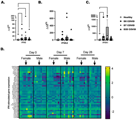Characterization of interferons and interferon-stimulated genes in COVID-19+ individuals. Healthy and COVID-19+ donor-derived PBMC were lysed, and RNA was collected and purified. Purified RNA was tested by RT-PCR for a panel of 32-interferon-related genes. (A) IFNG, (B) IFNA2, and (C) IFNA1 are independently shown as bar graphs with the mean the SEM of fold-change detected for each COVID-19 individual compared to the sex-matched control. Male COVID-19+ individuals were compared to male non-infected, and Female COVID-19+ were compared to female non-infected as baseline controls. The baseline controls were randomly selected and included with every PCR plate. (D) Representative heatmaps that show mean log fold-change across groups. Scale represents genes modified in comparison to over controls. Statistical significance and indicators are as described before (Figure 1).