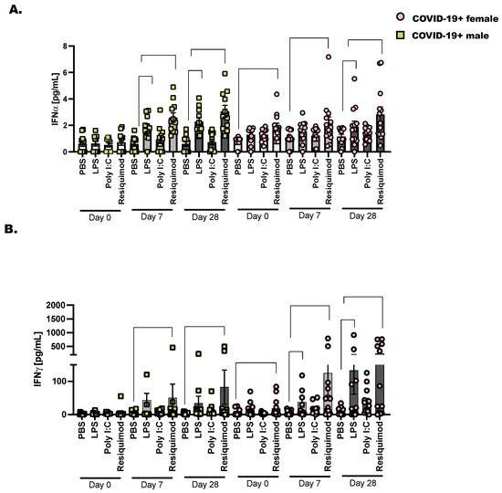 We chose to assess the activation of interferons following stimulation with TLR-agonists as before in COVID-19+ males and females from the day of diagnosis (day 0) to day 28 after SARS-CoV-2 detection (Figure 4). The bacterial ligand, LPS, activates the inflammatory response through the pattern recognition receptor (PRR), TLR-4. We found that when we stimulated PBMC from COVID-19+ donor samples collected on day 28, there was a significant increase in IFN over PBS stimulation. This pattern of increased IFN was more pronounced in the females compared to males. We anticipated that LPS would stimulate significant IFN production; this reached significance in day 7 stimulated samples for males but not females. However, when day 28 samples were stimulated ex vivo with LPS, we saw a significant increase in IFN in both male and female PBMC. Resiquimod induced significant IFN and IFN at day 7 and day 28 compared to PBS in COVID-19+ PBMC. This was significant in both male and female cells. Taken together, this is a strong indication that the immune response is sufficiently activated against future viral and bacterial responses in these non-hospitalized individuals.