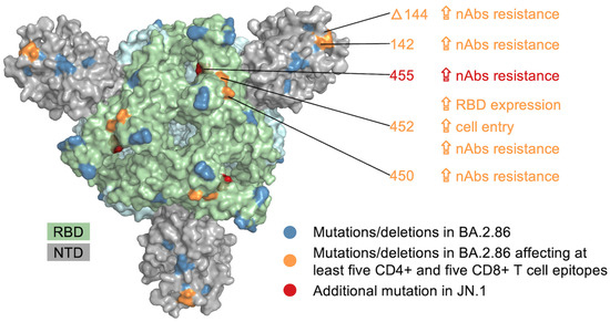 A single mutation can provide multiple advantages to the virus, including functional, structural, and immune escape benefits. Thus, we investigated whether BA.2.86 mutations that impact a substantial number of T cell epitopes (Figure 1A,B) had functional or structural significance. Specifically, we focused on mutations that affect a minimum of five CD4+ and CD8+ T cell epitopes each. Four BA.2.86 mutations/deletions within S met this criterion: a mutation at residue 142 and a deletion at residue 144 in the N-terminal domain (NTD), and two mutations at residues 450 and 452 in the receptor-binding domain (RBD) (see Figure 2). The existing literature indicates that these mutations are associated with increased resistance against neutralizing antibodies targeting the NTD or RBD [24,25,26,27,28]. The mutation at position 452 also provides functional advantages, including enhanced RBD expression and increased cell entry of the virus [6]. Moreover, the JN.1-specific S mutation at position 455, located in the RBD, also affects a notable number of T cell epitopes (five CD4+ and six CD8+ T cell epitopes; see Figure 3C,D). Like the other S mutations mentioned above, it increases resistance to neutralizing antibodies [6,24,27] (Figure 2). Thus, these findings suggest that specific BA.2.86 and JN.1 mutations within S have the potential to impact many known T cell epitopes while also exhibiting additional antibody escape and functional advantages.