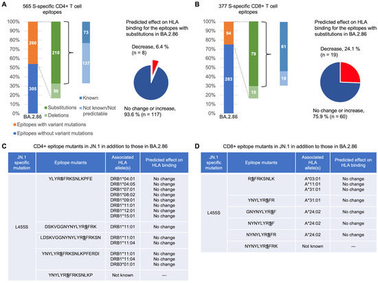 Predicted effect on the HLA binding of S-specific epitope mutants of BA.2.86 and JN.1. (A,B) show breakdowns of BA.2.86 epitopes for which HLA association is known, along with the predicted effect of Omicron BA.2.86 mutations on peptide–HLA binding. (C,D) show lists of epitopes in JN.1 (additional to those in BA.2.86) with known HLAs, along with their predicted effect on peptide–HLA binding. The complete list of CD4+ and CD8+ (mutant) epitope–HLA pairs and their predictions is provided in Supplementary Tables S3 and S4.