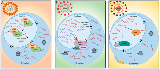 Viral manipulation of nuclear export pathways: (A) HBV viral protein HBc binds export proteins NXF1 to facilitate export of viral transcripts (red). (B) KSHV viral protein ORF10 binds export proteins NXF1-NXT1 to block export of cellular transcripts (purple) promoting export of viral transcripts (red). (C) MLV viral transcripts interact with NXF1 protein to promote their transport from the nucleus into the translation machinery, while other viral transcripts interact with CRM1 which marks them for further viral packaging.