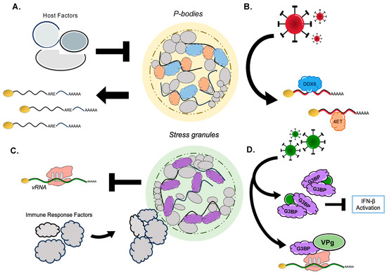 Due to their dynamic nature, diversity in composition, and temporal/environmental sensitivity, RNA granules’ functionality varies broadly from mRNA storage, degradation, and triage to assisting in cellular processes such as energetic conservation, the stress response, or the inflammatory response. This multitude of processes can readily be taken advantage of by viruses. Viruses and the host wage constant battles over the formation and regulation of RNA granules by manipulating RBPs, in a means to ultimately influence gene expression and lead to the arrest of certain cellular pathways to control the fate of RNA (Figure 2).