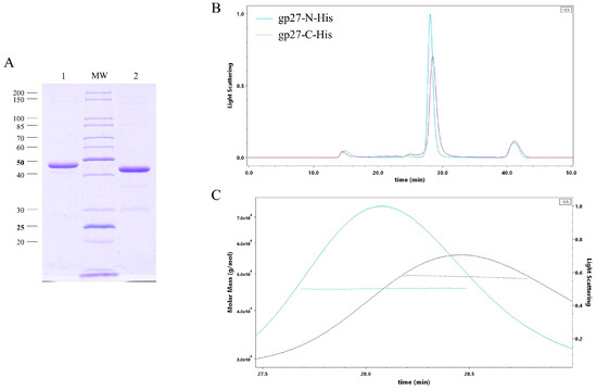 E. coli cells were transformed with plasmids encoding gp27 with either a C-terminal 11xHis-tag (gp27-C) or an N-terminal 10xHis-tag (gp27-N). The cells were cultured in a 2xYT medium containing 200 µg/mL ampicillin at 37 °C until the cultures reached the OD600 of 0.6. Subsequently, the culture temperature was reduced to 18°C, and gp27 expression was induced by the addition of isopropyl-ß-D-thiogalactopyranoside (IPTG) to a final concentration of 0.5 mM. The induced cells were grown at 18 °C overnight, and harvested by centrifugation at 8000× g and 4 °C for 10 min the next day. The resulting cell pellets were resuspended in a lysis buffer (50 mM Tris-HCl [pH 8], 150 mM NaCl, 1 mM dithiothreitol [DTT], 1 mM ethylendiamine tetraacetic acid [EDTA]) on ice and lysed by four passages in a French pressure cell at 16,000 psi. Before cell disruption 1 mM phenylmethylsulfonyl fluoride (PMSF), a spatula tip of DNaseI and 1 mM MgCl2 were added. The lysate was then centrifuged at 10,000× g and 4 °C for 15 min. The supernatant and Ni Sepharose 6 Fast Flow slurry were incubated at 4 °C for 45 min on a rotating wheel. The sample was loaded onto a 5 mL column and the flow through collected. After washing the matrix with 20 mL of the wash buffer (50 mM Tris-HCl [pH 8], 300 mM NaCl, 35 mM imidazole), the proteins were eluted with 10 mL elution buffer (50 mM Tris-HCl [pH 8], 150 mM NaCl, 300 mM imidazole, 1 mM DTT) in 2 mL fractions. The elution fractions containing the target proteins were further purified by size-exclusion chromatography (SEC). The samples were loaded onto a Superdex 200 increase 10/300 GL column connected to an AEKTA purifier 10 system, and eluted with gel filtration buffer (20 mM Tris-HCl [pH 8], 150 mM NaCl, 10% glycerol).