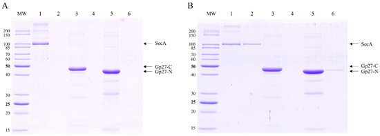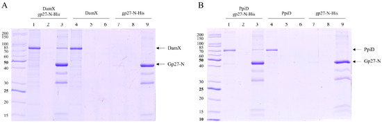 The interaction between gp27 and DamX was tested in more detail. Whereas gp27-N had a 10xHis-tag, a Strep-tag was added to DamX at its N-terminus. Both proteins were purified and tested for co-elution after affinity chromatography. The predicted molecular weight of DamX was approximately 46 kDa. However, our results demonstrate that the purified DamX protein runs at a slower rate than expected in SDS gel, at around 80 kDa (