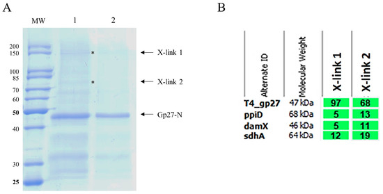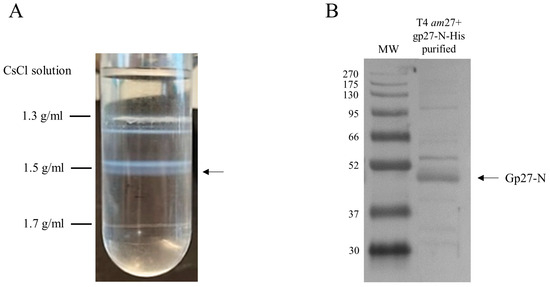 E. coli C2523 cells harboring plasmid pGZ119EH encoding gp27-N-His were grown in LB medium containing 25 µg/mL chloramphenicol at 37 °C until the culture had reached an OD600 of 0.6. The culture was induced by the addition of 0.3 mM IPTG for 10 min. Then, the cells were infected by T4 amber27 phages with a m.o.i. of 5 and after 7 min superinfected by additional phage with a m.o.i. of 5 for 53 min. The cells were harvested by centrifugation with 6000× g at 25 °C for 15 min. The pellet was resuspended in phosphate buffer containing 1 mM MgSO4 at 4 °C overnight. The next day, the pellet was treated with 0.05% Triton-X-100 at RT for 1h and centrifuged at 6000× g for 15 min to remove the cell debris and intact cells from the supernatant. The supernatant was recovered, and the phage was further purified in a cesium chloride (CsCl) step gradient ultracentrifugation in a SW28 rotor with 110,000× g at 18 °C for 2 h. The phage band was collected by using a sterile syringe and cannula and dialyzed against buffer T4 (20 mM Tris-HCl [pH 7.4], 20 mM NaCl, 10 mM MgCl2).