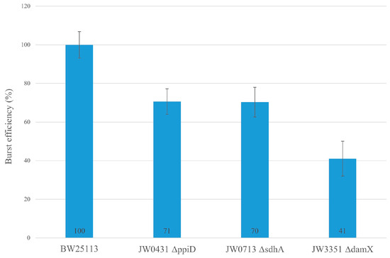 8]. T4 was added to a growing culture of the different host strains with an m.o.i. of 5. After 1h post-infection, the cells were lysed and analyzed for their phage progeny. When compared to the reference strain BW25113, the burst size was severely reduced by 60% when
