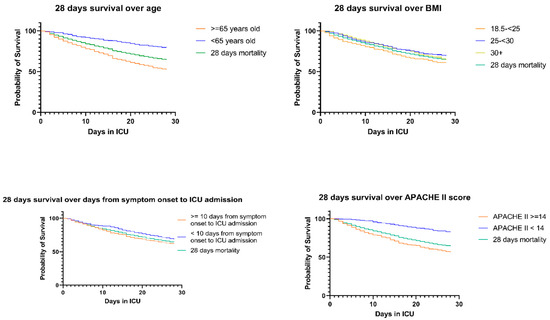 Kaplan–Meier curves for 28-day survival over age, BMI, days from symptom onset, and APACHE II score.