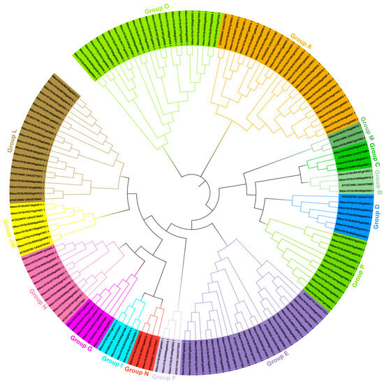 To determine the evolutionary relationships between the UGT family genes in N. benthamiana and Arabidopsis thaliana, a phylogenetic tree was constructed based on the amino acid sequence similarity of 19 UGTs in Arabidopsis thaliana that were distributed in 14 different groups from A–N and 147 NbUGTs using MEGA11.0 [8,12]. The results showed that the 147 NbUGTs were classified into 16 major phylogenetic groups, while all 14 conserved evolutionary groups (A–N) originally described in Arabidopsis thaliana were included in N. benthamiana (Figure 1). The number of NbUGTs in each group varied, with the largest one, Group A, containing 25 NbUGTs, and the smallest one, Group M, having only 2 members (Figure 1). In addition, two new evolutionary groups not found in Arabidopsis thaliana were identified in N. benthamiana: Group O with 24 members and Group P with 12 members (Figure 1).