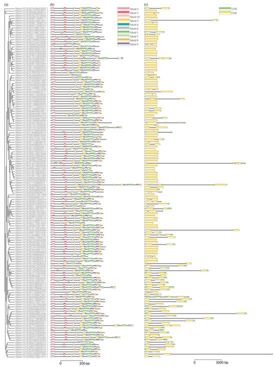 Analysis of conserved motifs and gene structure of NbUGTs. (a) Phylogenetic tree constructed using the NbUGT protein sequences. (b) Ten types of conserved motifs were predicted in the NbUGT protein sequences. Different motifs are shown in different color boxes. The sequence information for each motif is provided in Supplementary Table S1. (c) The gene structure of NbUGTs (untranslated regions, exons, and introns are shown as light green boxes, yellow boxes, and horizontal lines, respectively).