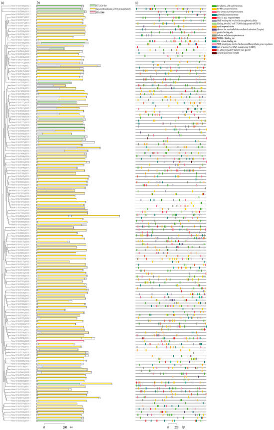 Predicted conserved domains and cis-acting elements of NbUGTs. (a) Phylogenetic tree constructed using the NbUGT protein sequences. (b) The conserved domains of the NbUGTs were analyzed through TBtools-II v1.108 software. (c) The type, quantity, and position of predicted cis-acting elements in the putative promoter regions of NbUGTs. Different elements are shown in different color boxes.