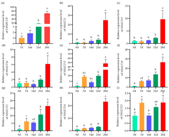 The expression patterns of 8 NbUGTs in CWMV-infected N. benthamiana plants. (a) The accumulation of CWMV CP in the assayed systemic leaves of N. benthamiana infected with CWMV at 7 to 28 days. (b–i) Relative expression levels of NbUGT1, NbUGT12, NbUGT16, NbUGT17, NbUGT19, NbUGT21, NbUGT24, and NbUGT25 in CWMV-infected N. benthamiana plants at 0 to 28 dpi. Each treatment had three biological replicates; the data presented are the means ± SD, determined using Student’s t-test. Different letters show statistically significant differences (p < 0.05, Tukey’s test).