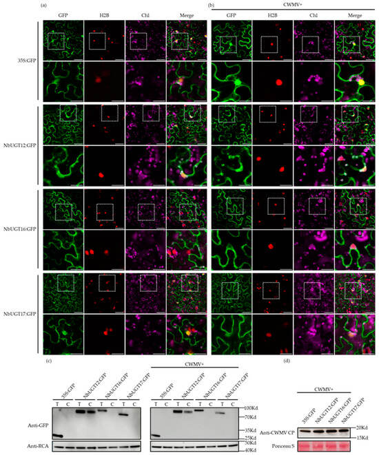 The protein functions are closely related to their subcellular localization. To analyze the characteristics and effects of the identified NbUGTs, their subcellular localizations were investigated using a website (http://cello.life.nctu.edu.tw/cello.html, accessed on 16 September 2022). Based on the predictions, NbUGT12 and NbUGT16 are most likely localized in the cytoplasm, while NbUGT17 has the potential localization in the cell membrane and cytoplasm (Table 1). Here, NbUGT12-GFP, NbUGT16-GFP, and NbUGT17-GFP were expressed in the transgenic N. benthamiana leaves (expressing H2B-RFP, a nuclear marker) via agroinfiltration. Non-fused GFP was used as a control. The inoculated leaves were collected at 72 h post-infiltration (hpi) to observe subcellular localization under a confocal microscope. The results revealed that NbUGT12-GFP was located in the cytoplasm and chloroplasts, NbUGT16-GFP was mainly located in the cytoplasm, whereas NbUGT17-GFP was present in the cytoplasm and nucleus (Figure 5a). To analyze the relationship between NbUGTs and CWMV, we tested whether CWMV affected the subcellular localization of the three proteins. Consequently, NbUGT12-GFP, NbUGT16-GFP, and NbUGT17-GFP were co-injected with CWMV in H2B-RFP transgenic N. benthamiana leaves using agroinfiltration. In brief, Agrobacterium individually harboring pCB-35S-R1 and pCB-35S-R2 were mixed with Agrobacterium harboring NbUGT12-GFP, NbUGT16-GFP, and NbUGT17-GFP in a 1:1:1 ratio, respectively. Mixed cultures were individually infiltrated into the plants leaves. At 7 dpi, the inoculated leaves were observed by confocal microscopy. The results showed no significant changes (Figure 5b). In addition, to determine whether these three proteins can express in chloroplasts, the chloroplast protein was extracted and analyzed using the WB assay. The results showed that NbUGT12 was indeed localized in the chloroplasts, while the control proteins, NbUGT16 and NbUGT17, did not express in the chloroplasts, regardless of CWMV infection (Figure 5c,d). In general, NbUGT12, NbUGT16, and NbUGT17 were primarily expressed in the cytoplasm, although NbUGT12 was also distributed in the chloroplasts and did not exhibit changes during CWMV infection.