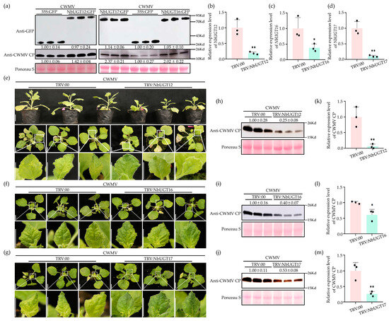 NbUGT12, NbUGT16, and NbUGT17 were also silenced in N. benthamiana by the TRV-mediated VIGS assay. Firstly, the infectious clones of TRV-NbUGT12, TRV-NbUGT16, and TRV-NbUGT17 were inoculated in N. benthamiana, respectively, with TRV: 00 serving as the control. The total RNA was extracted from the systemic leaves at 7 dpi, and qRT-PCR analysis was performed. The results showed that the expression levels of NbUGT12, NbUGT16, and NbUGT17 were reduced by approximately 80%, 60%, and 90% in TRV: NbUGT12-, TRV: NbUGT16-, and TRV: NbUGT17-infected plants, respectively, compared to those in TRV: 00-infected plants (Figure 6b–d). Subsequently, the plants successfully silenced NbUGT12, NbUGT16, and NbUGT17 were inoculated with CWMV, respectively. After another 30 dpi, the TRV: NbUGT12+CWMV-, TRV: NbUGT16+CWMV-, and TRV: NbUGT17+CWMV-inoculated plants exhibited milder CWMV disease symptoms than their controls (Figure 6e–g). In addition, TRV: NbUGT12+CWMV-inoculated plants were shorter than the controls, indicating that NbUGT12 may also play a significant role in plant growth (Figure 6e). The total RNA and protein were extracted from the systemic leaves. Then, the accumulation levels of CWMV CP in these plants were analyzed by WB and qRT-PCR assays. The WB assay revealed a lower accumulation of CWMV CP in TRV: NbUGT12+CWMV-, TRV: NbUGT16+CWMV-, and TRV: NbUGT17+CWMV-inoculated plants than in TRV: 00+CWMV-inoculated plants (Figure 6h–j). Moreover, qRT-PCR analysis revealed that the transcriptional levels of CWMV CP were downregulated by approximately 95%, 40%, and 75% in the TRV: NbUGT12+CWMV-, TRV: NbUGT16+CWMV-, and TRV: NbUGT17+CWMV-inoculated plants, respectively, compared those in the control plants (Figure 6k–m). In summary, these findings suggested that NbUGT12, NbUGT16, and NbUGT17 positively regulate CWMV infection in N. benthamiana.