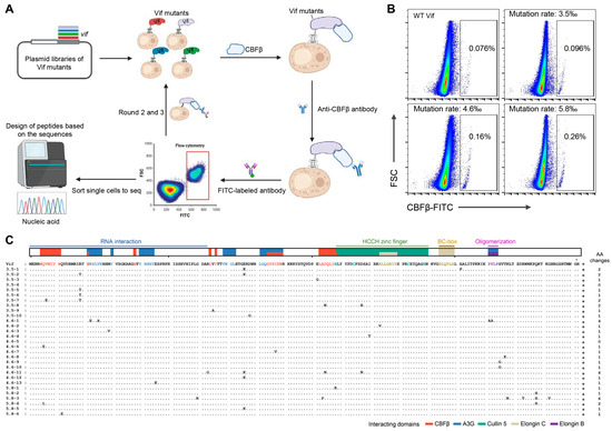 Screening of Vif mutants with higher affinity for CBFβ by yeast surface display. (A) Schematic diagram of the screening process. Plasmid libraries with random mutations in the Vif-encoding gene were used for the transduction of yeast cells. The yeast cells displaying Vif mutants were successively incubated with purified CBFβ protein, anti-CBFβ antibody, and FITC-labeled secondary antibody. After three rounds of sorting enrichment by flow cytometry, the top single cells in the FITC-positive cell population were sorted for vif fragment amplification and sequencing. (B) Fluorescence-activated cell sorting (FACS) plots showing the sorted FITC-positive cells from the third round of enrichment. The FITC-positive rates of cells expressing wild-type (WT) Vif and Vif mutants with the library mutation rate of 3.5‰, 4.6‰, and 5.8‰ are demonstrated in the black rectangular gates, respectively. The top 0.01% of cells from each Vif mutant group were sorted. (C) Alignment of the amino acid sequences of sorted Vif mutants. The reported functional domains of Vif are demonstrated in different colors above the sequences [66]. Dots indicate no mutations. A short dash indicates an amino acid deletion. * indicates the stop code. The number of amino acid (AA) changes per sequence is highlighted on the right.
