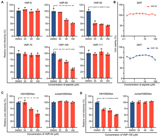 Peptides VMP-63 and VMP-108 decreased HIV-1 infectivity in an A3G-dependent manner. (A) The effect of peptide treatment on the infectivity of NL4-3 packaged with A3G. HEK293T cells were co-transfected with pNL4-3 and pVR-A3G-cmyc. Here, 25 μM, 50 μM, or 100 μM of different peptides were added to the cells 4 h post-transfection. DMSO was added as a negative control. The viral infectivity was tested by infecting TZM-bl cells with the culture supernatants of HEK293T cells collected at 48 h post-transfection. The viral infectivity of the DMSO treatment groups was set to 100%. (B) Different concentrations of VMP-63 and VMP-108 showed no cytotoxicity in HEK293T cells. The peptides were diluted by 2-fold from 100 μM and incubated with the cells for 48 h. The cell viability of the DMSO-treated group was set to 100%. (C,D) Chronically infected H9/HXB2Neo cells and Jurkat/HXB2Neo cells were treated with VMP-63 (C) or VMP-108 (D) at 25 μM, 50 μM, or 100 μM for 48 h. The viral infectivity was tested in TZM-bl cells using the culture supernatants of these two cells. Error bars represent the standard deviation (SD) calculated from three independent experiments. Statistical significance was assessed by the Student’s t-test. * indicates p < 0.05; **, p < 0.01; ***, p < 0.001; ns, not significant.