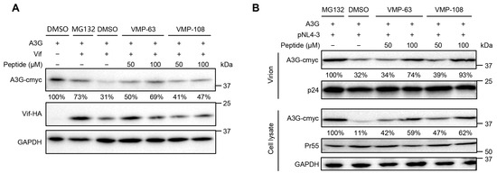 VMP-63 and VMP-108 rescued the level of A3G protein in transfected HEK293T cells and viral particles. (A) Detection of A3G levels in the presence of Vif with peptide treatment by Western Blotting. HEK293T cells were co-transfected with pVR-A3G-cmyc and pVR-Vif-HA and then incubated with 50 or 100 μM VMP-63 or VMP-108 or DMSO. A proteasome inhibitor, MG132, was used as a positive control. The expression level of A3G in the absence of Vif was set to 100%. The level of A3G was quantified by Image J and normalized with GAPDH. (B) The effect of peptides on the level of A3G packaged into viral particles. HEK293T cells were co-transfected with pVR-A3G-cmyc and pNL4-3 and then incubated with 50 or 100 μM of VMP-63 or VMP-108. After 48 h post-transfection, the cells and the supernatants containing viral particles were harvested for Western blotting. The levels of A3G in cell lysates or virions were normalized by the level of GAPDH or p24, respectively. The A3G level of the MG132 treatment group was set to 100%.