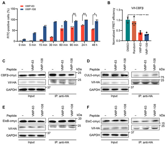VMP-63 and VMP-108 could rapidly enter cells and inhibit the binding between Vif and CBFβ. (A) VMP-63 and VMP-108 could rapidly accumulate in cells. After the addition of 5 μM of FITC-labeled peptides to HEK293T cells, the percentage of FITC-positive cells increasing with time was analyzed by flow cytometry. The mean ± SD values of three independent experiments are shown. (B) VMP-63 and VMP-108 blocked the Vif-CBFβ interaction detected by fluorescence resonance energy transfer (FRET). HEK293T cells were transfected with Vif-YFP and CBFβ-CFP and then incubated with 100 μM VMP-63 or VMP-108, random peptide, or DMSO for 48 h. The peptides significantly reduced the FRET efficiency between Vif and CBFβ. The normalized FRET efficiency is calculated by the E (FRET) values from Table 3. The average FRET efficiency of the DMSO-treated group was set to 1.0. Statistical significance was assessed by the Student’s t-test. (C–F) The peptides specifically affected the interaction of Vif with CBFβ in the E3 complex. HEK293T cells were co-transfected with Vif-HA and CBFβ-cmyc (C), CUL5-cmyc (D), EloB-cmyc (E), or EloC-cmyc (F) with or without the addition of VMP-63 or VMP-108. After 48 h of transfection, the cells were harvested and analyzed by Co-IP experiments. * indicates p < 0.05; **, p < 0.01; ns, not significant.