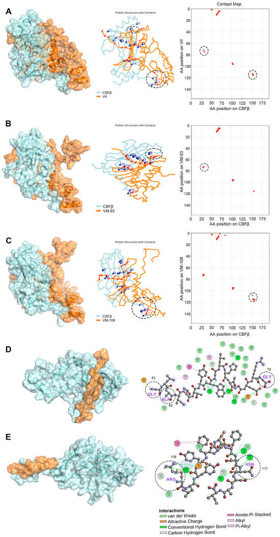 Representative conformations of Vif and the Vif mutants with CBFβ. (A–C) Depiction of the CA backbone (left), interacting residues (middle), and contact matrices (right) for the interaction between CBFβ and WT Vif (A), a Vif mutant with the mutations in region 63 to 78 as VMP-63 (VM-63) (B), or a Vif mutant with the mutations in region 108 to 120 as VMP-108 (VM-108) (C). The interacting residues on Vif and CBFβ were indicated in red and blue dots, respectively. The position and number of the interacting sites in the regions 63 to 78 and 108 to 120 of Vif were marked in dashed circles. (D,E) Illustration of the representative conformations of VMP-63 (D) and VMP-108 (E) peptide-CBFβ complexes. The interacting sites on CBFβ (indicated in colored circles) with the peptides and the interaction forces are highlighted on the right. The mutated residues in the peptides are indicated in dashed circles.