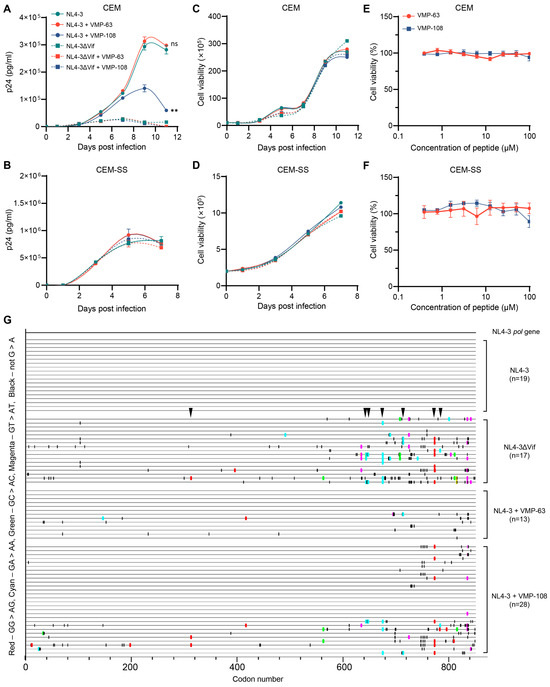 VMP-108 specifically inhibited the replication of HIV-1 in nonpermissive T cells. (A,B) VMP-108 restricted the replication of NL4-3 in CEM cells. NL4-3 (solid circles) and NL4-3ΔVif (solid squares) of equal amounts of p24 were used to infect CEM (A) and CEM-SS (B) cells, and the viral production was monitored for 11 or 7 days and quantified every other day using a p24 ELISA kit. The peptides were added at 50 μM and replenished every 48 h. (C,D) The cell viability of the infected cells. The CEM (C) and CEM-SS (D) cells infected above were quantified by trypan blue staining every other day. (E,F) Different concentrations of VMP-63 and VMP-108 showed no cytotoxicity on CEM (E) and CEM-SS (F) cells. The peptides were diluted by 2-fold from 100 μM and incubated with the cells for 48 h. The cell viability of the DMSO-treated group was set to 100%. Error bars represent the SD calculated from three independent infections. Statistical significance was assessed using a two-way ANOVA between the indicated and the positive control curves. (G) Highlighter plot analysis of the pol gene sequences. The pol gene fragments (about 850 bp) from the culture supernatant samples collected on day 11 from the infected CEM cells of (A) were amplified to analyze the frequency of A3-induced G-to-A mutations (labeled in red and cyan). Red, GG-to-AG mutations. Cyan, GA-to-AA mutations. Green, GC-to-AC mutations. Magenta, GT-to-AT mutations. Black, non-G-to-A mutations. The locations indicated by black arrows show the same A3-induced G-to-A mutation sites that occurred in the NL4-3ΔVif and NL4-3+VMP-108 groups.