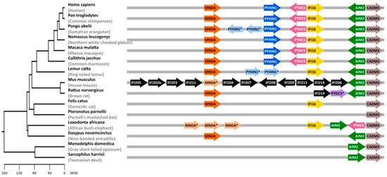 Mammalian PYHIN gene locus. Syntenic blocks containing PYHIN paralogs from selected mammalian species are shown on the right. Arrows indicate the direction of the open reading frames (ORFs). Genes annotated as orthologs are shown in identical colors. Genes annotated as PYHIN1-, MNDA-, or PYDC3-like genes are marked with an asterisk “*”. Note that identical names do not necessarily indicate true orthologs. In mice, most genes are shown in black as it is not possible to clearly identify orthologs in other species. CADM3 has been included as a reference gene flanking the PYHIN gene locus. Gene lengths, distances, and overlaps are not drawn to scale, and some overlapping and additional ORFs were omitted for clarity. A time-calibrated phylogenetic tree of mammalian evolution generated with TimeTree [26] is shown on the left. MYA—million years ago.