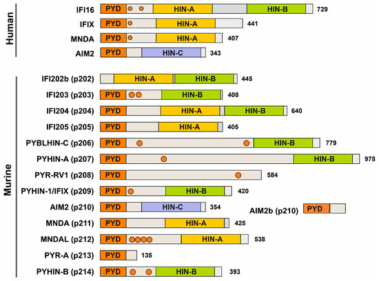 PYHIN genes evolved in mammalian species and have undergone extensive gene expansion and divergence [7,18]. It is thought that initially, an HIN domain emerged in the common ancestor of marsupials and placental mammals. Later, three distinct forms (HIN-A, -B, and -C) evolved in placental mammals [7]. The number of PYHIN genes varies enormously between different mammalian species. Marsupials, such as opossums and Tasmanian devils, harbor only a single PYHIN coding sequence (Figure 1). Cats encode 2 PYHIN proteins, humans 4 (AIM2, IFI16, IFIX/PYHIN1, and MNDA), and mice a total of 13 (Figure 1). Despite the significant diversity among PYHIN proteins in mammals, bats are the only group reported to lack the entire PYHIN gene locus; only a truncated version of AIM2 has been identified in one bat species, Pteronotus parnellii [31]. Among PYHIN proteins, AIM2 is unique as it diverges significantly from other PYHIN proteins and is the only one with clear orthology across numerous species. Phylogenetic analyses of the HIN and Pyrin domains suggest that human and mouse AIM2 are the only direct orthologs [7]. While there are no direct orthologs of human IFI16, IFIX, or MNDA in mice, mouse p204, p205, p207, and p211 cluster with human IFI16 and IFIX in phylogenetic analyses [7,18], suggesting that they may exert similar activities. Gene duplications are commonly observed in immune genes and may allow diversification of expression patterns, targeting of newly emerging pathogens, or evasion of viral antagonists [32,33,34]. Mice are infected with a large variety of viral families, and it is tempting to speculate that the multiplication of Pyhin genes was driven by the need to defend and control a wide range of pathogens.
