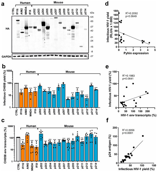 Expression of PYHIN proteins and inhibition of HIV-1. (a) Expression of human and mouse PYHIN proteins. HEK293T cells were transfected with IRES-BFP constructs expressing the indicated HA-tagged PYHIN proteins. GAPDH was used as loading control. (b) Infectious virus yields in cell supernatants of HEK293T cells cotransfected with vectors expressing the indicated PYHIN proteins and the proviral HIV-1 CH058 construct were determined by TZM-bl cell infection assay at two days post-transfection. Data show mean percentages (±SEM; n = 3). (c) Levels of viral env transcripts in HEK293T cells cotransfected with expression constructs for the indicated PYHIN proteins and the proviral HIV-1 CH058 construct determined by qRT-PCR. Data show mean percentages (±SEM) from 3 experiments, each performed in technical duplicates relative to those detected in the presence of the empty control plasmid (100%). * p < 0.05, ** p < 0.01, *** p < 0.001. (d–f) Correlations between the effects of overexpression of PYHIN proteins on infectious HIV-1 yield and (d) the levels of PYHIN proteins detected by Western blot, (e) env RNA transcripts, and (f) p24 antigen levels. Values in panels d and e were derived from the results shown in panels (a–c).