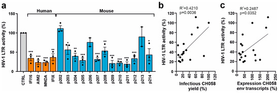 To obtain further insight into the mechanism underlying the inhibitory effect of mouse PYHIN proteins on infectious HIV-1 production, we examined their effect on the activity of an HIV-1 NL4-3 LTR firefly luciferase reporter construct [23]. Consistent with published data [23,37], the three nuclear human PYHIN proteins, IFI16, MNDA, and IFIX, reduced HIV-1 LTR-driven luciferase activity by ~70 to 80% (Figure 4a). Most mouse PYHIN proteins also inhibited HIV-1 LTR activity, with p204, p205, p207, p209, p210, p211, p212, and p214 being about as effective as the human PYHIN proteins. In agreement with their poor inhibitory effect on infectious HIV-1 yield (Figure 3b), p202, p206, and p213 displayed little if any effect on HIV-1LTR activity (Figure 4a). In contrast, human AIM2 and its mouse ortholog p210 inhibited LTR-driven luciferase expression by ~80% (Figure 4a). This came as a surprise and needs further investigation since at least human AIM2 is predominantly found in the cytoplasm and did not reduce the levels of HIV-1 CH058 env transcripts. Altogether, the impact of the 4 human and 13 mouse PYHIN proteins on HIV-1 NL4-3 LTR promoter activity correlated significantly with their effects on infectious HIV-1 CH058 yields (Figure 4b) and (less well) the expression levels of env transcripts (Figure 4c). However, correlations were far from perfect, suggesting that the inhibition of viral transcription plays an important but not the only role in the inhibitory effects of mouse and human PYHIN proteins.