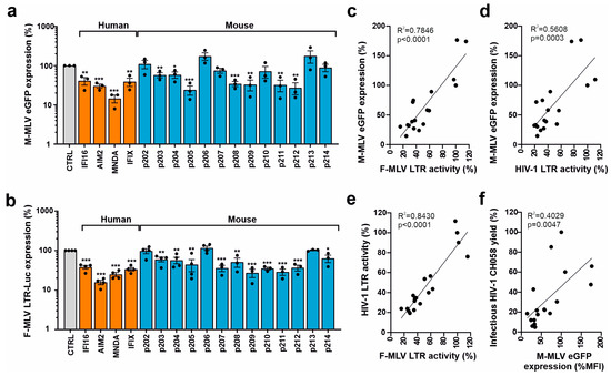 To determine the restriction of a murine retrovirus, we cotransfected HEK293T cells with PYHIN expression vectors and an env-defective proviral Moloney MLV construct containing an eGFP reporter gene. The four human PYHIN proteins and most mouse PYHIN proteins (except p202, p206, and p213) suppressed LTR-driven eGFP expression by the Moloney MLV proviral construct, albeit with differential efficacy (Figure 5a). To clarify whether mouse PYHINs interfere with the LTR-driven transcription of mouse retroviruses, we examined their ability to inhibit luciferase expression driven by a Friend MLV LTR construct (Figure S2). All four human PYHIN proteins and 10 of the 13 mouse PYHIN proteins significantly inhibited Friend MLV (FV) LTR activity by 50% to 85% (Figure 5b). Altogether, the inhibitory effects of the different human and murine PYHIN proteins on Moloney MLV-driven proviral eGFP expression correlated significantly with those on Friend MLV LTR-dependent luciferase expression (Figure 5c). Similarly, PYHIN proteins inhibiting transcription of mouse retroviruses also inhibited HIV-1 LTR activity (Figure 5d,e). Notably, the effect of the PYHIN proteins on eGFP expression by the proviral MLV construct also correlated significantly with their effect on infectious HIV-1 production (Figure 5f). Altogether, these significant but imperfect correlations suggest that human and mouse PYHIN proteins inhibit mouse and human retroviruses by overlapping mechanisms.