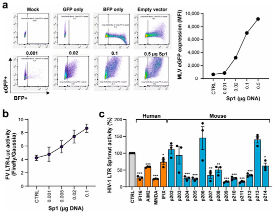 Sp1 enhances MLV gene expression but is not essential for inhibition by mouse PYHIN proteins. (a) HEK293T cells were cotransfected with increasing amounts of expression constructs for Sp1 IRES BFP (0.001, 0.02, 0.1, and 0.5 µg) and MLV eGFP construct. BFP and eGFP expression was analyzed by flow cytometry. The left panel shows primary FACS data, and the right panel shows the mean fluorescence intensities (MFIs) of eGFP in BFP expressing population. (b) HEK293T cells were cotransfected with a firefly luciferase reporter construct under the control of FV LTR and a vector expressing an increasing amount of Sp1 (0.001, 0.005, 0.02, and 0.1 µg) or an empty control. In addition, a Gaussia luciferase reporter construct was transfected as an internal control. Shown are firefly relative to Gaussia luciferase values measured in the presence of Sp1 overexpression; n = 3 ± SEM. (c) HEK293T cells were cotransfected with an NL4-3 LTR firefly luciferase reporter construct containing mutated Sp1 binding sites and expression constructs for the indicated PYHIN proteins. Values show mean percentages (±SEM) of firefly luciferase expression relative to those detected in the absence of PYHIN protein (100%) and were derived from three experiments. * p < 0.05, ** p < 0.01, *** p < 0.001.