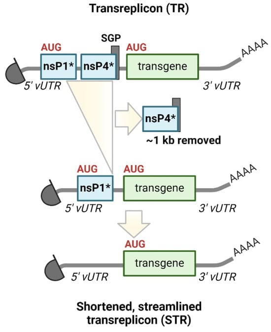 Because the first generation of taRNA proved efficient in the PoC study, we recently generated strategies to optimize the taRNA platform by simplifying the structure of the TR [76]. The TR simplification involved removing remnants of the replicase gene, the SGP and subgenomic transcript formation, resulting in a shortened TR (STR) closely resembling conventional mRNA. Notably, the STR retained alphaviral RNA promoters within the UTRs (Figure 3). STRs resemble promoterless helper-RNA [35], albeit with additional 5′ CSE modifications. By eliminating the original start codon and further AUG triplets, the start codon of the desired antigens became the most 5′-AUG, resulting in bypassing the translation of peptides corresponding to the replicase nsP1 N-terminus. Compensating mutations were introduced to preserve the structure and function of the 5′ CSE, while the SGP was eliminated without replacement. Transgenes encoded on the STR became accessible for translation from the 5′ cap. Unlike previous TRs, and similar to promoterless helper-RNAs, STRs no longer form subgenomic RNA species upon replication, producing only genomic replication products. To enhance STR amplification, a directed evolution strategy was employed, resulting in the accumulation of faster replicating mutant templates characterized by an extended 5′ end. Moreover, the flexibility of the taRNA platform was highlighted by the successful replication of various heterologous STRs by the SFV replicase, including Forth Morgan virus, Aura virus, Highlands J virus, Madariaga virus and CHIKV, thereby confirming findings in the literature [45,57].