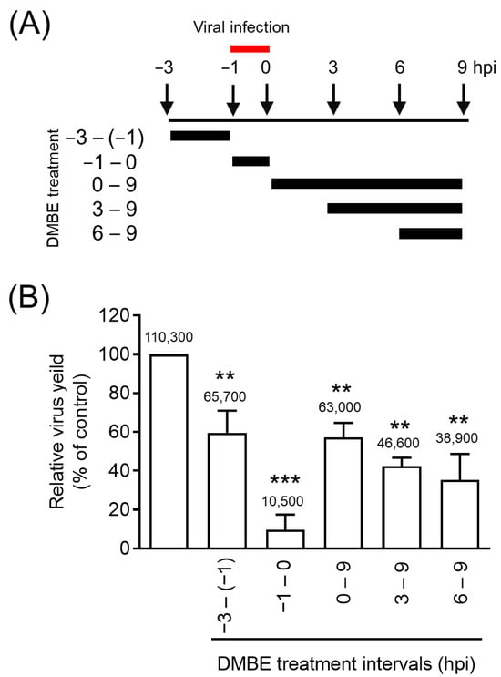MDCK cells were initially seeded at a density of 5 × 105 cells/well in six-well plates, following which they were infected with influenza A virus WSN/33 (MOI = 0.1) within the time interval of −1 to 0 h, lasting for 1 h (adsorption stage). The MDCK cells underwent incubation with DMBE at a concentration of 20 µg/mL at three principal time intervals, i.e., pre-adsorption (−3 to −1 h), adsorption (−1 to 0 h), and post-adsorption (0 to 9 h, 3 to 9 h, and 6 to 9 h). At 9 hpi, the culture supernatants were collected to determine the viral titer via a plaque formation assay.