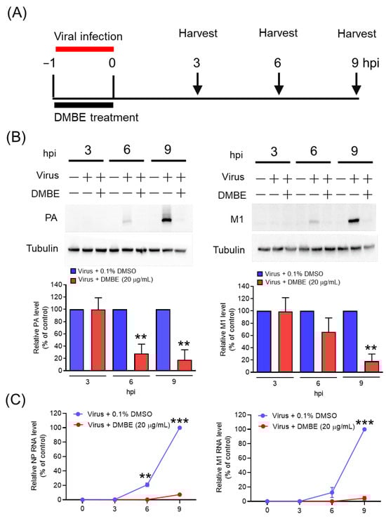 We proceeded to explore the impact of DMBE on viral RNA and protein synthesis (Figure 3). MDCK cells underwent infection with IAV (MOI = 0.1) in an environment containing either 0.1% DMSO or DMBE for a period of 1 h. Subsequent to the removal of unattached viruses, the cells were allowed to incubate and were harvested at the specified time intervals (3, 6, and 9 hpi) for viral RNA and protein analysis via immunoblotting and qRT-PCR, respectively (Figure 3A). The expression of viral proteins, as signified by PA and M1, as well as RNA (NP and M1), exhibited a time-dependent increment in the absence of DMBE treatment (Figure 3B). DMBE displayed a considerable ability to suppress not only the levels of viral proteins but also viral RNA expression (Figure 3B,C). Based on these findings, we infer that DMBE has the potential to curb viral entry, thereby resulting in the suppression of viral RNA and proteins and inhibiting viral replication.