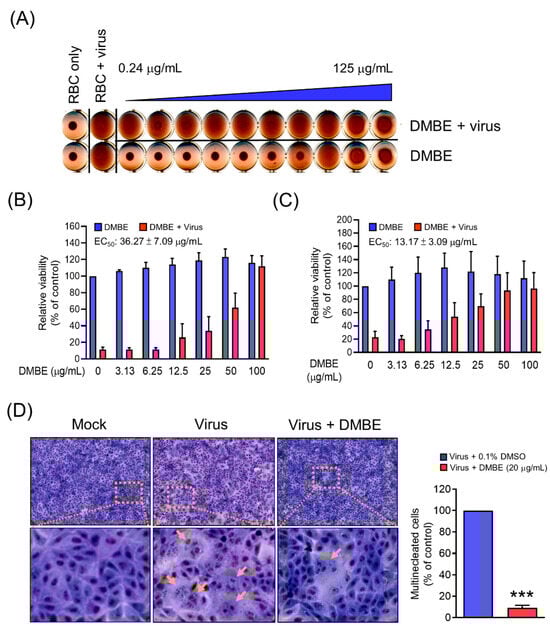 Interactions between viruses and lipids are pivotal for the replication of enveloped viruses, encompassing processes such as viral entry, assembly, and budding. Targeting these interactions represents a viable approach for creating broad-spectrum antiviral drugs. Recently, small molecules and peptides have demonstrated large-spectrum activity against various enveloped viruses, including SARS-CoV-2 and IAV. This activity involves compromising viral membrane integrity, inhibiting virus–cell membrane fusion, and interfering with cellular endocytosis [,,]. In our study, the observed effects of DMBE on the enveloped virus and IAV-induced cell fusion suggested that it exhibits anti-lipid activity. To specifically examine the anti-lipid activity of DMBE, in a future study, the antiviral components derived from DMBE will be investigated. Additionally, experiments based on previous publications will be designed and performed to further explore this aspect.