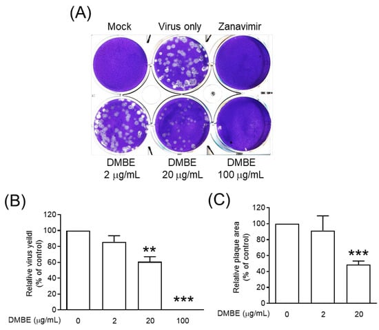 MDCK cells were seeded (5 × 105 cells/well) in six-well plates and infected with influenza A virus WSN/33 (approximately 50 plaque-forming units) before being kept on ice for 1 h. The viral suspension was then removed and the cells were rinsed twice with PBS. These infected MDCK cells were subsequently exposed to E0 containing 0.3% agarose in the presence of either 0.1% DMSO, 0.5 µM zanavimir, or 2–100 µg/mL DMBE. Following a 72 h incubation period at 37 °C, the agarose was discarded and the cells were fixed with 4% PFA for 1 h at room temperature. This was followed by 20 min of staining with 0.1% crystal violet at room temperature. Finally, the plaque numbers and areas were analyzed using the MetaMorph offline imaging system software, version 7.1(Universal Imaging, West Chester, PA, USA).