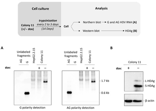Confirmation of HDV-regulated replication in colony 11 by Northern and Western blot. Cells were cultured as depicted in the diagram for 14 days in the presence or absence of dox. (A) RNA was extracted from cell lysate, normalized after quantification with a nanodrop, and subjected to Northern blot for the detection of both polarities of HDV RNA in the presence or absence of dox. (B) Cellular total proteins were analyzed for the presence of HDAg isoforms in the presence or absence of dox by Western blot. G, genomic; AG, antigenomic.