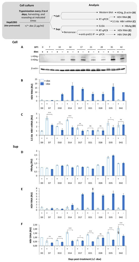 Characterization of HepG2BD cells. Dox pre-treated cells were seeded and cultured in the presence or absence of dox as depicted in the diagram. Cells and supernatants were harvested at the indicated days post-treatment (DPT). Cells were analyzed for the presence of HDAg isoforms normalized to β-actin (A), HDV RNA (B), and HBV 3.5 kb mRNA (C). Supernatants were analyzed for the presence of HBsAg (D), HDV virions (E), and Dane particle (F). Details concerning the analysis of each component are given in the diagram as well as in the Section 2. RU, relative unit, normalized to D0 + dox. ns: p-value > 0.05; *: p-value ≤ 0.05; **: p-value ≤ 0.01; ***: p-value ≤ 0.001. ‡: ~6.1 × 106 HDV RNA copies/mL; §: 5.3 × 105 HBV DNA copies/mL.