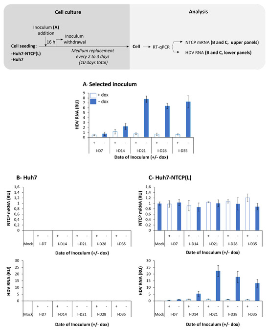 Infectivity of HDV virions produced by HepG2BD cells in Figure 2 was monitored after inoculation of Huh7-NTCP cells (see Section 2) with equal volumes of selected supernatants collected between days 7 and 35 of the kinetic experiment (Figure 3A). Huh7 cells were used as the negative control (Figure 3B). Levels of intracellular HDV RNA at 10 days post-inoculation showed that Huh7-NTCP cells were susceptible to infection with HDV virions produced by the HepG2BD cells (Figure 3C, lower panel).