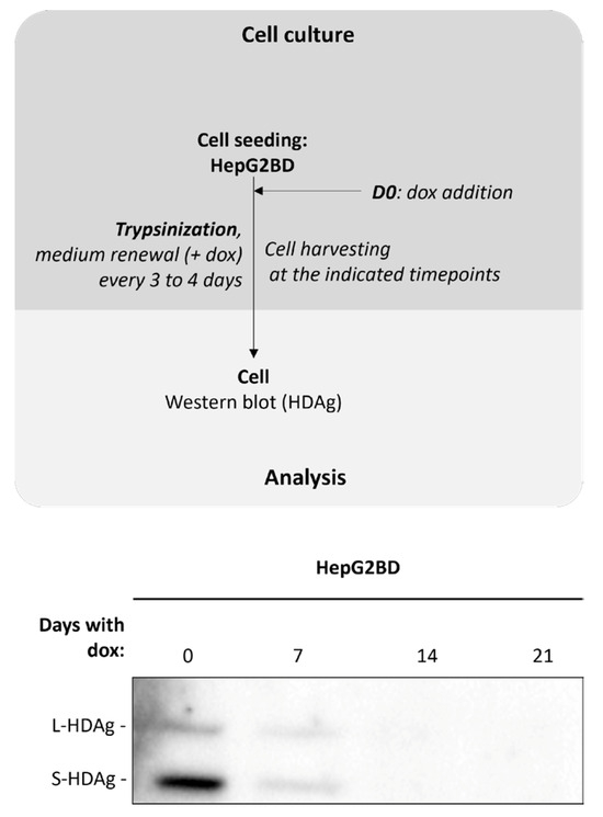 Inhibition of HDV replication by addition of doxycycline in HepG2BD. Cells were subjected to dox treatment for up to 21 days as depicted in the diagram and analyzed by Western blot for their ability to synthesize HDAg isoforms at each of the indicated timepoints.
