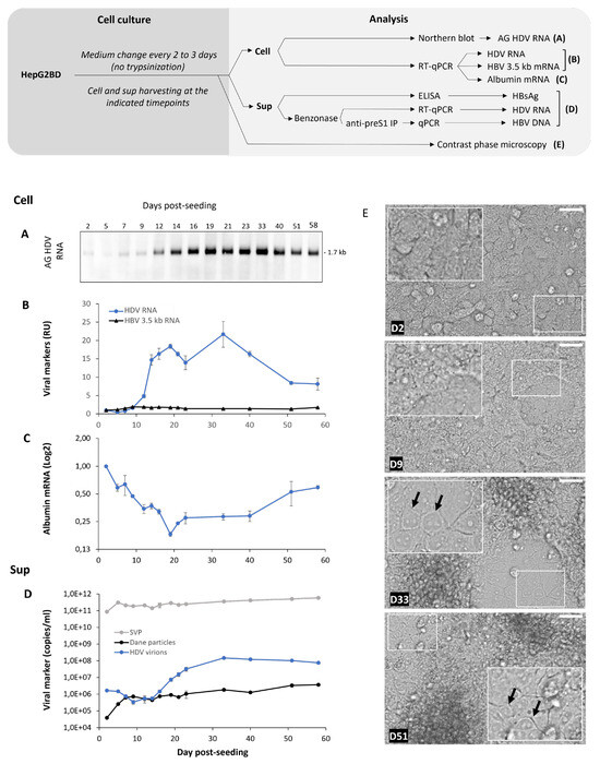 Effect of HepG2BD cell line prolonged quiescence on HDV and HBV replication, intracellular albumin RNA, and viral secretion: 58 days course. The conducted experiment is depicted in the diagram and aimed to assess the effect of non-trypsinization of the cells on HDV and HBV viral lifecycles as well as on albumin mRNA, a liver function marker. (A) Northern blot analysis of cellular antigenomic HDV RNA. (B) Cellular HDV RNA and 3.5 kb HBV mRNA quantifications. (C) Albumin mRNA quantifications. (D) HBsAg, HDV RNA, and HBV DNA monitoring in the supernatant. (E) Cells were observed by contrast phase microscopy at different timepoints post-seeding as indicated for each picture. Arrows point toward HepG2BD cells with hepatocyte-like morphology. Details about the analysis are depicted in the diagram as well as in the Section 2. Scale bars: 50 µM. RU, relative unit, normalized to D2. AG, antigenomic.