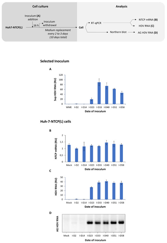 Selected inoculums were adjusted to 4% PEG-8000 (Sigma, Oakville, ON, Canada) and added to Huh7-NTCP(L) for 16 h. Cells were then washed with PBS every 2 to 3 days. At day 10 post-inoculation, cells were harvested and total cellular RNA was extracted. NTCP mRNA and total HDV RNA were quantified as described below. Total RNA was also analyzed for the presence of genomic and/or antigenomic HDV RNA by Northern blot as described below.