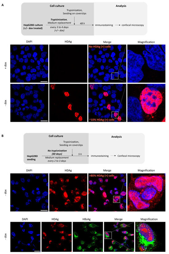 Effect of culture pattern and presence of doxycycline on the rate of HepG2BD cells actively replicating HDV. (A) As depicted in the diagram, HepG2BD cells were regularly trypsinized in the presence or absence of dox, prior to seeding on glass coverslip for 48 h, and fixation with PFA. Cells were then stained with DAPI (blue) and with an anti-HDAg antibody (red). (B) HepG2BD cells were seeded and maintained in collagen-treated wells in the absence of dox for 40 days. Cells were then trypsinized and seeded on coverslips for 5 h, fixed with PFA, and stained with DAPI (blue), and an anti-HDAg antibody (red). An additional immunostaining of HBsAg (green) was conducted in the lower set of pictures. Scale bars: 25 µM.