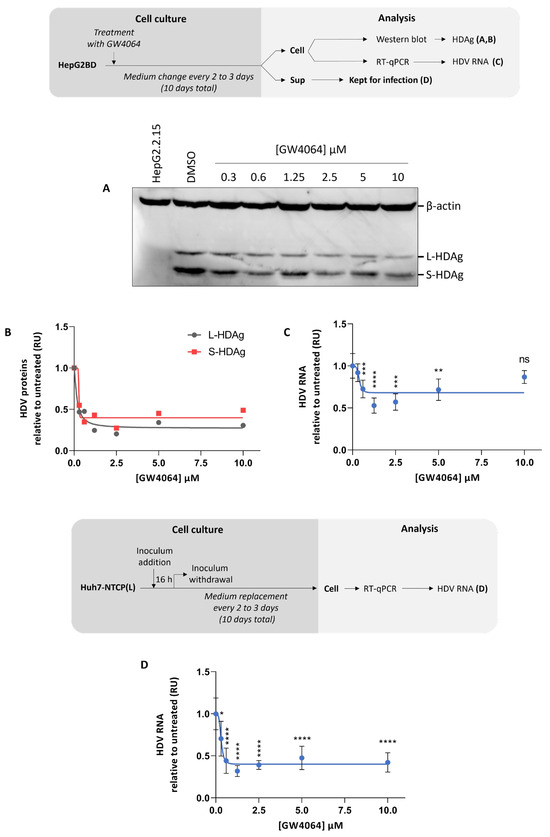 Antiviral effect of FXR agonist GW4064 on HDV in the HepG2BD cell line. As depicted in the diagram, cells were treated with various concentrations of GW4064. At 10 days post-treatment, cells and supernatant were harvested. Cellular total proteins were analyzed for the presence of HDAg isoforms by Western blot (A). Densitometry analyses from (A) are presented as ratios of S-HDAg or L-HDAg normalized to levels of β-actin (B). Intracellular HDV RNA (C) were quantified. As depicted in the diagram, Huh7-NTCP(L) cells were infected with harvested supernatants and cultured for 10 days. HDV RNA were quantified by RT-qPCR (D). RU, relative unit, normalized to mock. ns: p-value > 0.05; *: p-value ≤ 0.05; **: p-value ≤ 0.01; ***: p-value ≤ 0.001; ****: p-value ≤ 0.0001.