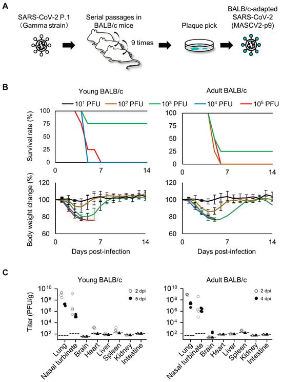 Virulence of MASCV2-p9 in BALB/c mice. (A) Schematic image of SARS-CoV-2 adaptation to BALB/c mice. (B) Survival rate and body weight changes of MASCV2-p9-infected mice. Four mice per group of young (6-week-old) or adult (18-week-old) BALB/c mice were infected with 101 to 105 PFU of MASCV2-p9, and survival and body weight were monitored daily for 14 days. The results are expressed as the mean ± SD. (C) Virus titers in organs of MASCV2-p9-infected mice. Four mice per group were euthanized and virus titers in the lungs, nasal turbinate, brain, heart, liver, spleen, kidney, and intestines were determined using plaque assays in VeroE6/TMPRSS2 cells. Dashed lines in the panels indicate the detection limit of the assay for each organ. Triangles in the panels indicate that the value was below the detection limit.