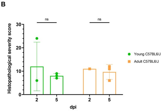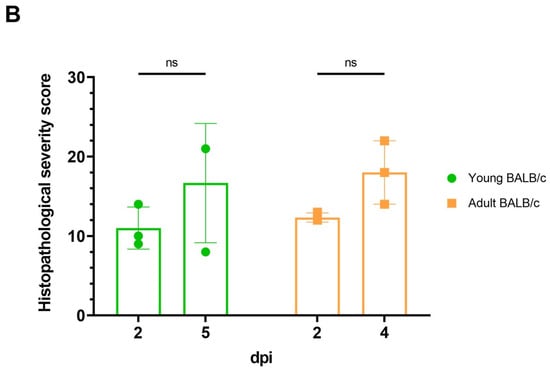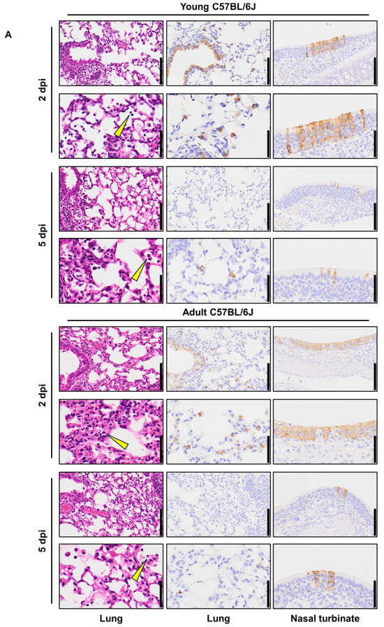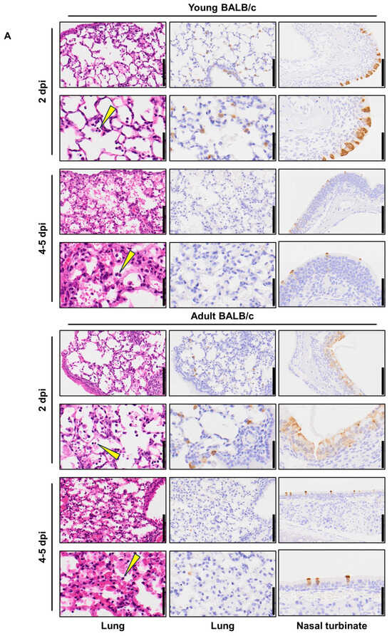 To evaluate the replication and pathogenicity of MASCV2-p9 in BALB/c mice, we used two age groups of mice: 6-week-old (adolescent) and 18–20-week-old (mature adults). Mice were intranasally infected with 103 PFU of MASCV2-p9. In the younger (6-week-old) and older (18-week-old) age groups, MASCV2-p9 exhibited high pathogenicity with MLD50 (mouse lethal dose 50; the dose required to kill 50% of infected mice) values of 103.3 PFU and 102.7 PFU, respectively (Figure 1B). The infection of mice with MASCV2-p9 resulted in high virus titers in the nasal turbinates and lungs in both the younger and older (20-week-old) age groups at Day 2 post-infection (Figure 1C). No substantial difference in viral titers in the respiratory organs at this timepoint was observed. The viruses were also recovered from the brain, heart, liver, and/or spleen (note: the brain samples collected for virus titration included the olfactory bulb). In the younger age group at Day 5 post-infection, MASCV2-p9 was detected in the respiratory organs of the infected animals at a titer of more than 1.02 × 105 PFU/g, but the virus was not detected in any other organs tested. Given the greater reduction in body weight observed in infected adult mice compared to young mice, organ sampling was conducted on Day 4 post-infection rather than Day 5 post-infection. At Day 4 post-infection of the older mice, MASCV2-p9 was detected at a titer of more than 9.84 × 105 PFU/g in the respiratory organs. Additionally, MASCV2-p9 was found in the brains of these animals at Day 4 post-infection. We then examined the histopathologic changes in the organs of the younger and older (20-week-old) age groups after MASCV2-p9 infection. A histopathological analysis revealed the infiltration of inflammatory cells such as neutrophils and mononuclear cells into the alveolar regions, accompanied with fibrinous exudates, in the lungs of both young and adult BALB/c mice at 2 days post-infection with MASCV2-p9 (Figure 2A). At the same timepoint, a viral antigen was detected by immunohistochemistry mainly on alveolar epithelial cells in both groups. At Day 5 (young) or Day 4 (adult) post-infection, there was a mild exacerbation of the histopathological inflammation score for both groups, although this alteration was not statistically significant (Figure 2B). Additionally, clear decreases in the number of virus-positive cells were observed in both groups. Virus-positive epithelial cells were also observed in the nasal turbinate of both groups at all timepoint examined with a clear decrease in the number of positive cells over time (Figure 2A). No virus-positive cells or significant morphological changes were detected histopathologically in the brain, heart, liver, spleen, kidney, or intestine.