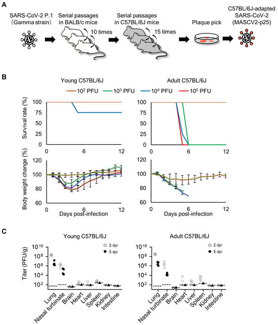 Virulence of MASCV2-p25 in C57BL/6J mice. (A) Schematic image of SARS-CoV-2 adaptation to C57BL/6J mice. (B) Survival rate and body weight changes. Four mice per group of young (6-week-old) or adult (24-week-old) C57BL/6J mice were infected with 101 to 105 PFU of MASCV2-p25, and survival and body weight were monitored daily for 12 days. The results are expressed as the mean ± SD. (C) Virus titers in organs of MASCV2-p25-infected mice. Four mice per group were euthanized and virus titers in the lungs, nasal turbinate, brain, heart, liver, spleen, kidney, and intestine were determined using plaque assays in VeroE6/TMPRSS2 cells. Dashed lines in the panels indicate the detection limit of the assay for each organ. Triangles in the panels indicate that the value was below the detection limit.