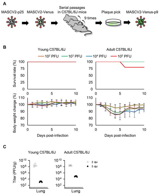 Young (6–8-week-old) and adult (18–24-week-old) female BALB/c mice (Japan SLC Inc., Hamamatsu, Japan) and C57BL/6J mice (Japan SLC Inc., Hamamatsu, Japan) were used in this study. Baseline body weights were measured before infection. Mice were intranasally inoculated with 101−5 PFU (in 50 μL) of the parental virus (TY7-501), MASCV2-p9, MASCV2-p25, or MASCV2-Venus-p9. Body weight was monitored daily for 10–14 days.